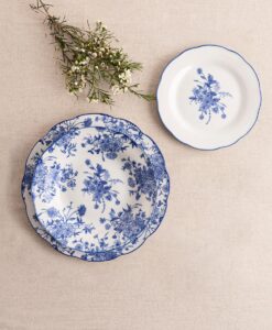 Fabricada en porcelana blanca de alta calidad, decorada en azul con relieves orgánicos que aportan elegancia a cada pieza con un claro estilo inglés.